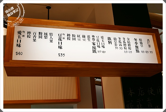 | 停車下來喝喝糖水^^,連價目牌也帶著濃濃得設計感~蠻意外能將賣愛玉這件事做得如此設計感 |