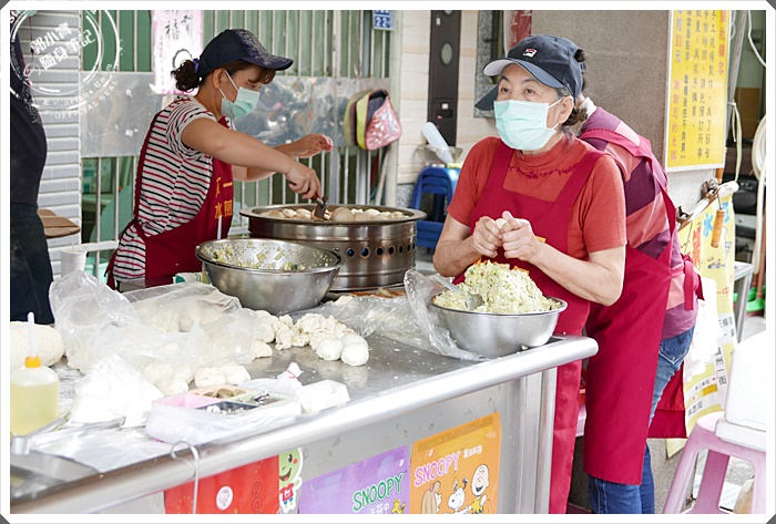 | 攤位上有好多人每個人都分工合作,有人揉麵團,有人招呼客人,有人忙著將煎包下鍋..... |