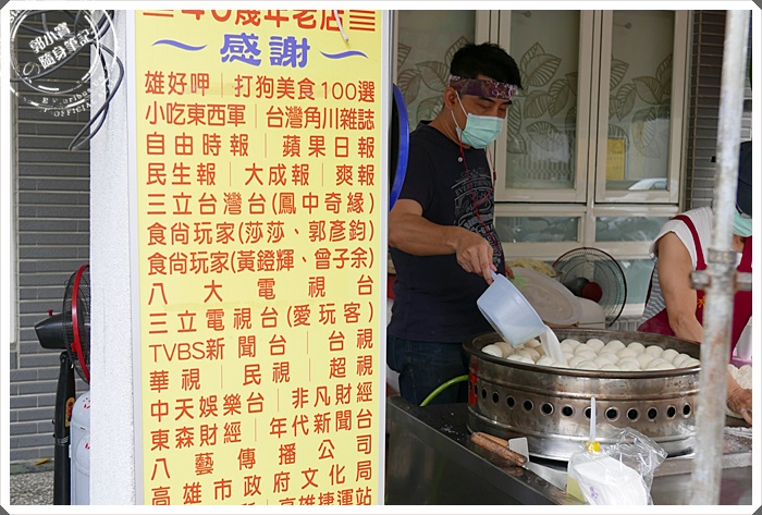 | 已經是媒體早就爭相報導到爆的小吃了~~~還是打狗人氣小吃百名內~~~這張照片還剛好拍到了老闆正要下麵粉水~~~準備煎水煎包了唷! |