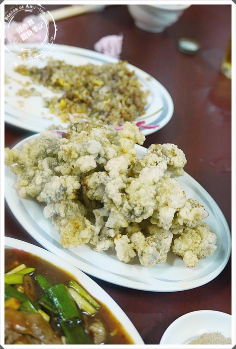 | 眾所矚目的炸蚵仔酥~~~那白花花的一座山好像金元寶一樣^^,光是用看的就覺得開心,蚵仔酥其實要好吃並不簡單,但家味炸功也不錯,問過每一個人都稱讚好吃,油也瀝的乾,可見油溫很高才下鍋的! |