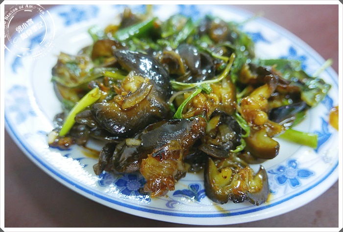 | 炒螺肉~由於都叫小盤的份量所以也不太懂這樣倒底算是多還少?只記得在外頭炒螺肉好像不便宜,感覺上CP值應該還不錯,不過寶妹沒有搶到所以沒吃到,只知道炒的油油亮亮的賣相佳。 |
