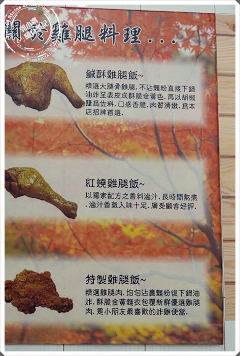 | 光是雞腿飯就有三種,寶妹選的是鹽酥雞腿飯,也是他們家的招牌,應該也是現點現炸只是寶妹去買飯才剛好五點鐘而已,現場等還是要一會兒的時間。原來雞腿也可以做出這麼多的差異性阿~完全就看個人對於雞腿的喜好嘍,像寶妹就有一陣子非常愛吃滷雞腿飯,但高雄好吃的滷雞腿飯好像不多~~如果有網友們知道的也歡迎分享給寶妹知道唷^^ |