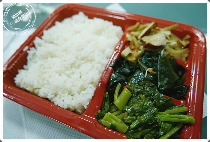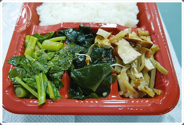 | 選了三樣菜是炒時蔬、海帶芽、豆干炒榨菜~~我對於配菜還算是滿喜歡的,口味夠鹹但不會太油膩,其實不能太油是便當的關鍵,原因是很多人包便當都不是馬上吃掉,會有一段通勤時間,所以如果太油膩冷掉了之後.....嘿嘿可想而知反而會感覺特別油! |
