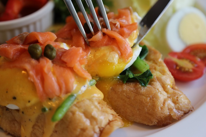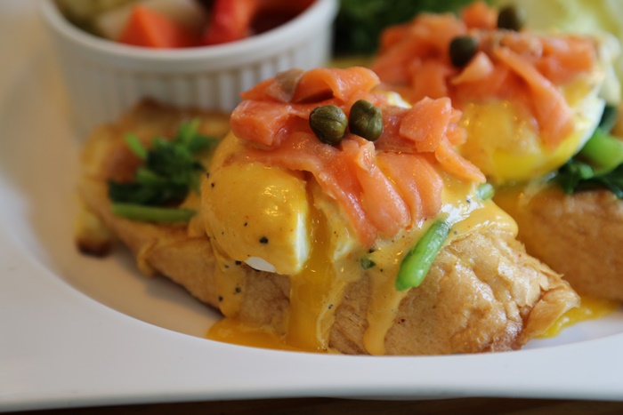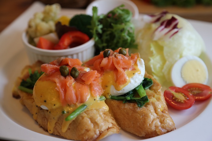 | 因為剛起床的關係,所以我選擇了早午餐的班尼克但系列,看來看去還是選擇了鮭魚班尼克蛋的選擇,上桌的時候還滿大的一份,配色也滿漂亮的,看起來就感覺到滿豐富的。 |