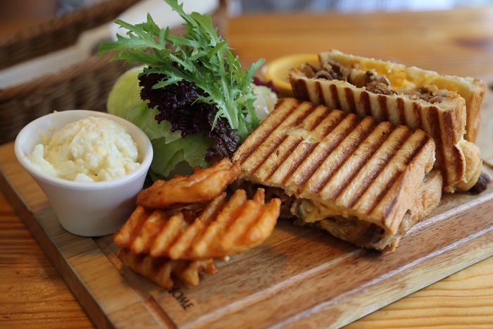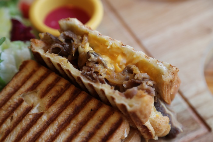| 三明治的土司烤的酥脆,夾著起司根牛肉碎片一起入口,咀嚼過後味道跟口感倒也不錯,可惜牛肉沒有發揮太大的作用,牛肉的口感跟味道幾乎都消失了,基本上換成什麼肉都是一樣了,但是我也算是喜歡。 |
