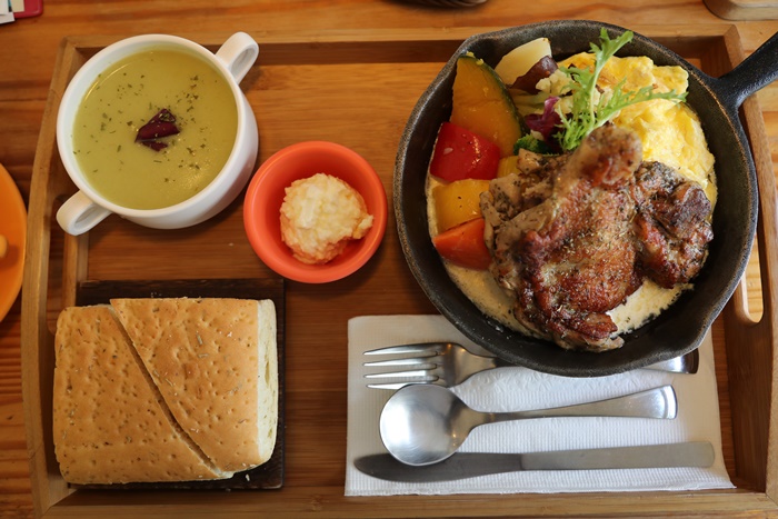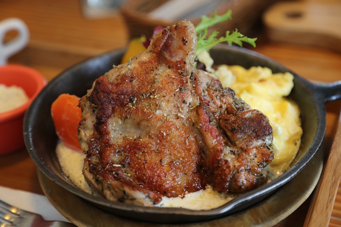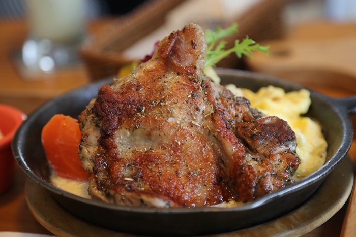 | 雞腿肉還算嫩口,肉汁也保留的滿多的,帶點迷迭香氣相當不賴,下層鋪的炒蛋增加了雞腿的味道層次感。 |