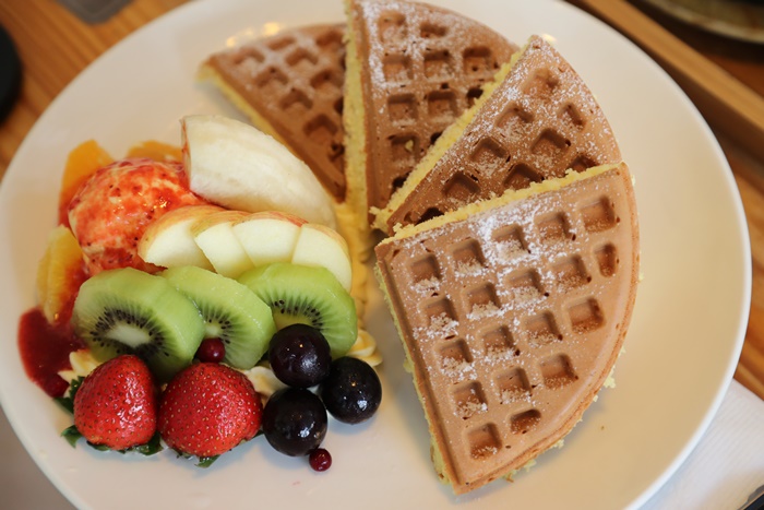 | 鬆餅吃起來比較中式一點,但是鬆餅粉的麵甜香還滿夠的,非常有誠意厚鬆餅! |