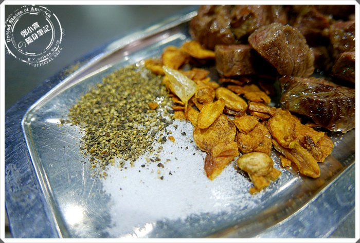 | 有趣的是他沙朗牛肉的擺盤,左半邊直接放上大量的蒜片、黑胡椒粒還有海鹽,可以直接依照喜好增添來吃,也增加了美觀擺飾的效果,寶妹是覺得這一點還挺不錯的構思!