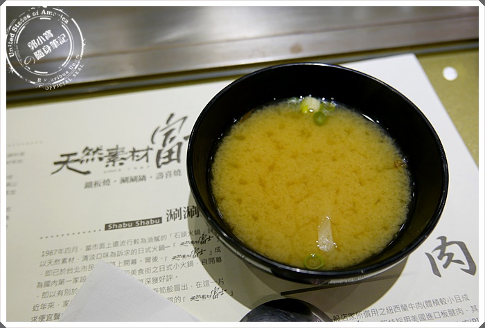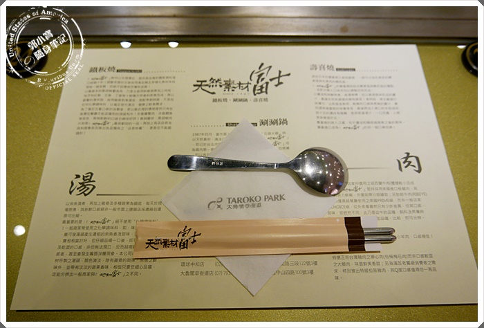 | 桌上的餐紙還有寫上店家的素材使用以及堅持,本身天然素材富士這個品牌是還有涮涮鍋以及壽喜燒的多元經營,但在大魯閣草衙道的只有鐵板燒的服務 |