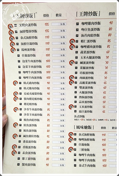 | 炒飯的菜單實在是太大張了,只好分兩部分拍大家比較看得清楚,林林總總四十幾種炒飯任君挑選,雖然比阿成少了些選擇,但是實在是選擇好多阿 |