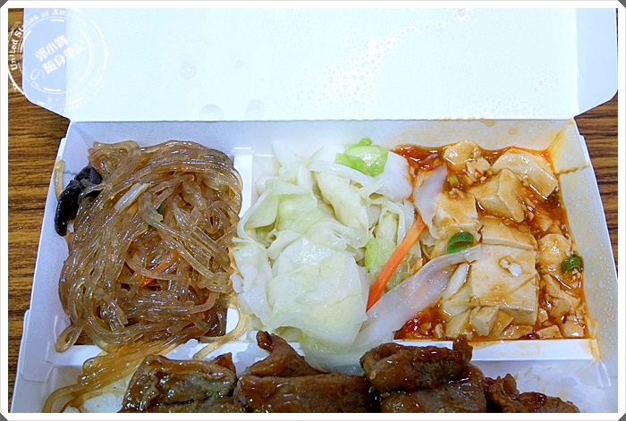 | 其實分量還不錯耶!每一盒的菜都滿滿的,感覺很大器,肉也很均勻地舖在白飯上面。 |
