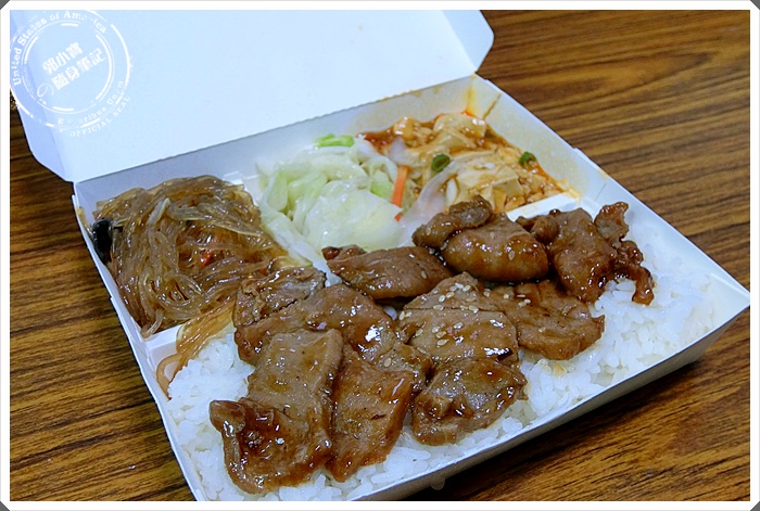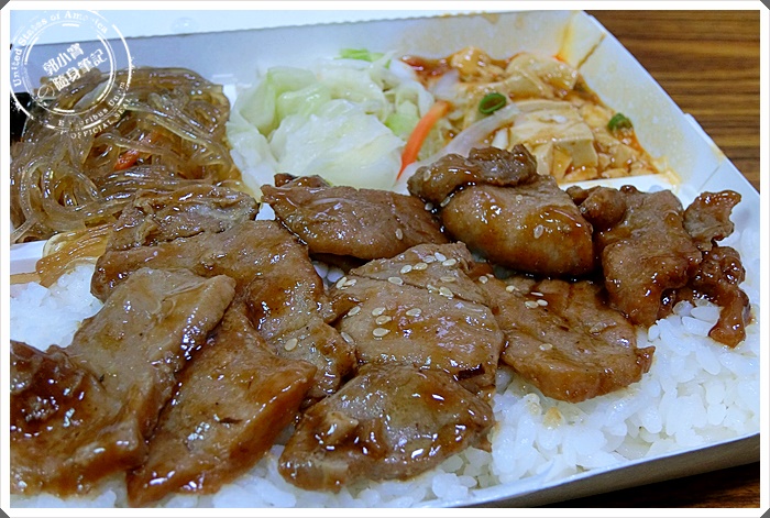 | 他們的烤肉便當烤肉的部分就不太一樣了,外頭的烤肉便當會向是燒肉便當那樣乾乾的,而食府烤肉便當的烤肉是有滿滿醬料的,比較香滑一些也是很好下飯,一開始單吃吃起來甜甜的,但其實非常夠味,上頭在撒上一些白芝麻提香,讓寶妹很快速的就把整盒白飯跟著烤肉一起吃完了唷 |