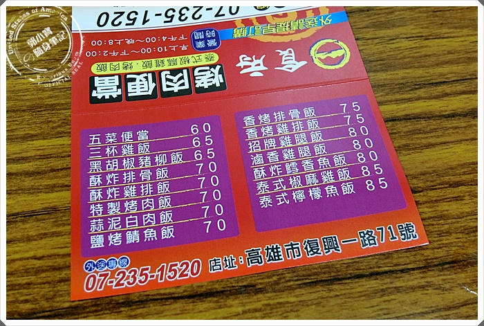 | 店面上的價目表有點難拍,寶妹分享名片上的價目表比較清楚。還有泰式椒麻雞跟泰式檸檬魚耶!整體便當還挺平價的不是太貴,一般的雞腿排骨飯也都算是很超值的70元(哀~以前的50元便當已不復見) |