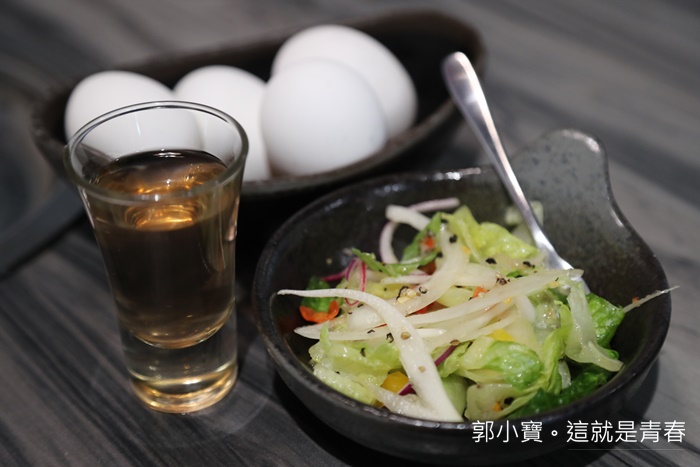 | 點完餐後就送上來的開胃果醋跟生菜沙拉,第一次吃小火鍋還有果醋飲跟生菜沙拉,而且蛋還是本身就含在套餐裡面,這也太超值了,可能是我們在北部生活太久了,真的好讚! |