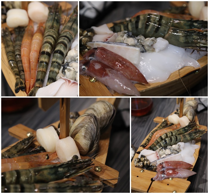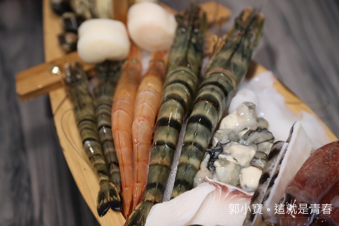 | 這雙人海陸套餐真的太哭北了,cp值高到一個破表,還有伊比利豬,上面鋪滿了超新鮮的海鮮,當中又以大草蝦最為顯眼,老實說這一份海鮮船在台北最少要賣到800以上,但是這熊飽鍋物不用500就可以入手,真的是太划算了,仔細一算除了大草蝦以外,還有其他兩種蝦子,小管、花枝、大蛤、干貝通通都有,真的很彭派! |