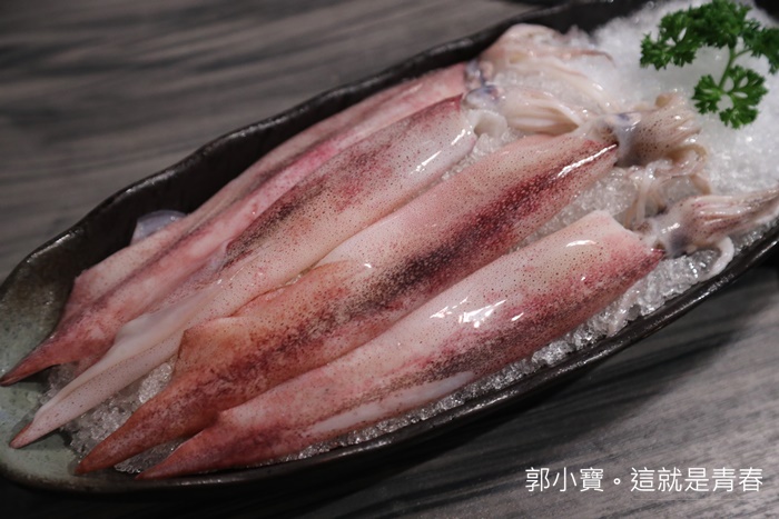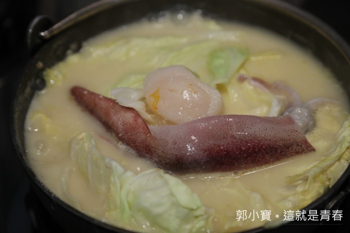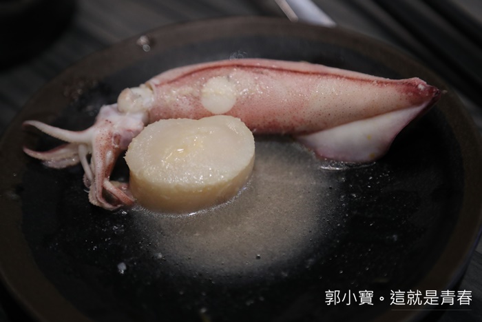 | 我只能說熊飽鍋物真的是太誇張了,老闆有沒有那麼狂阿,打卡就送小管,小管也超大一隻,放進鍋裡還要稍微將他翻折一下,不然根本塞不進去鍋裡面,連同海鮮傳裡的干貝一起入鍋煮。 |