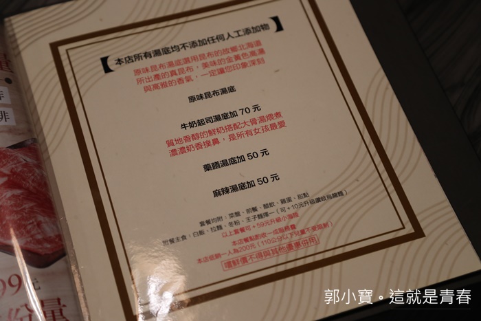 除了原味昆布鍋以外,其他的鍋物都需要另外加價,牛奶鍋的部分需再加價70元,而麻辣跟藥膳則需要另外加價50元,我個人覺得還滿合理的,因為他們家特別標明全部的鍋底都不加人工添加物,也就是全部的湯頭都是熬煮出來的,跟粉泡的湯底完全是不一樣的。 |