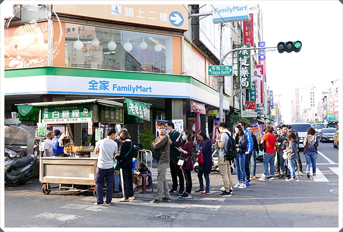 | 晚場的苓雅夜市尚未轉換攤位,在轉角的這家老牌白糖粿已經在大排長龍了,可以說是幾乎沒有斷過人龍,寶妹一直看他就是這樣的誇張隊伍,不管平日假日都是耶!從對面來看實在是超誇張的,大約每一次去都是前面排了10~20個人...有夠壯觀的。 |