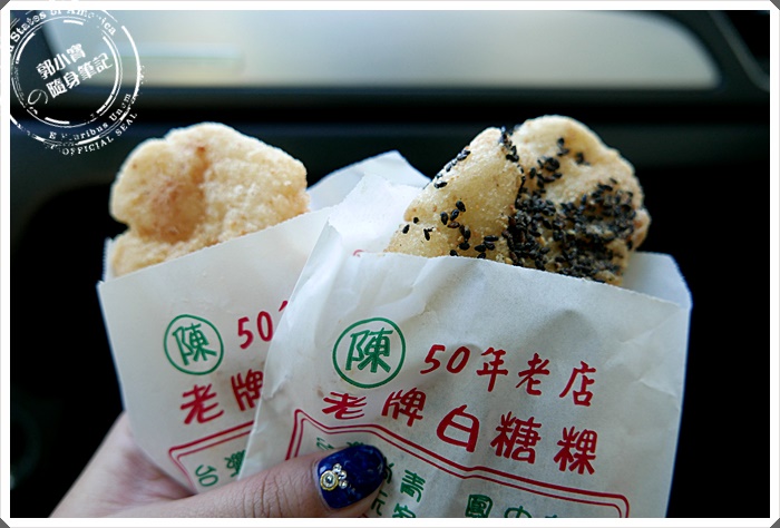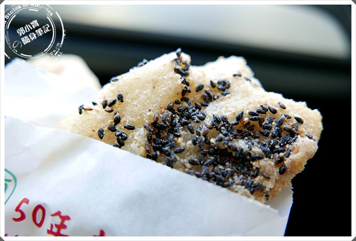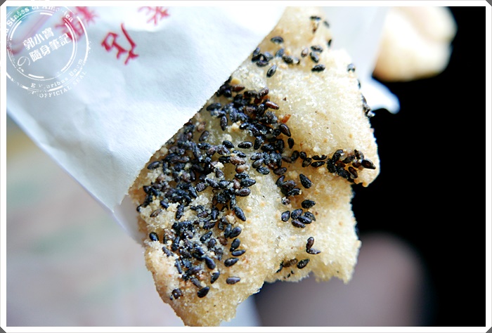 | 老牌白糖粿的黑芝麻使用的特別大顆,也因次因為芝麻沾上的體積讓白糖粿沾到的糖粉較少,芝麻香氣沾附在剛起鍋的酥炸外皮上,拚了命的散發出芝麻香,果真吃起來整體也不甜膩,非常淡雅耐人。 |