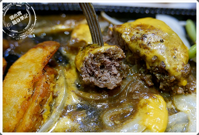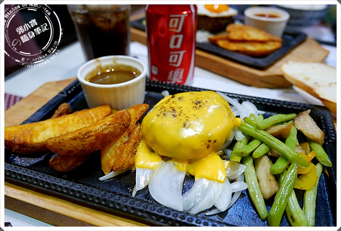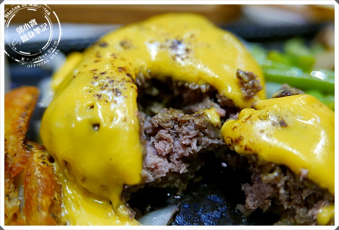 | 再來是寶妹的牛肉漢堡排$250,這邊是加選了起士片,沒想到起士片上桌可以把整個牛肉漢堡排都包覆了XDD,基本的鐵盤配菜都一樣,大家或許有察覺同樣供應160g的肉品,牛肉漢堡排似乎顯得比較小,這是正常的唷^^,牛肉本身的油脂組成就是與豬肉不同,也就是雖然重量一樣,但呈現的質量密度不同XD,密特先生是高成本的選用選用美國特選級(U.S. Choice )牛排肉自行用絞肉機製成,實在是相當費工又高成本阿~ |