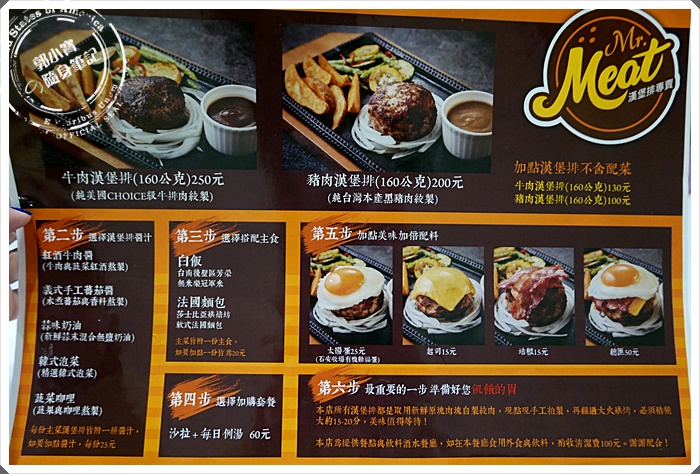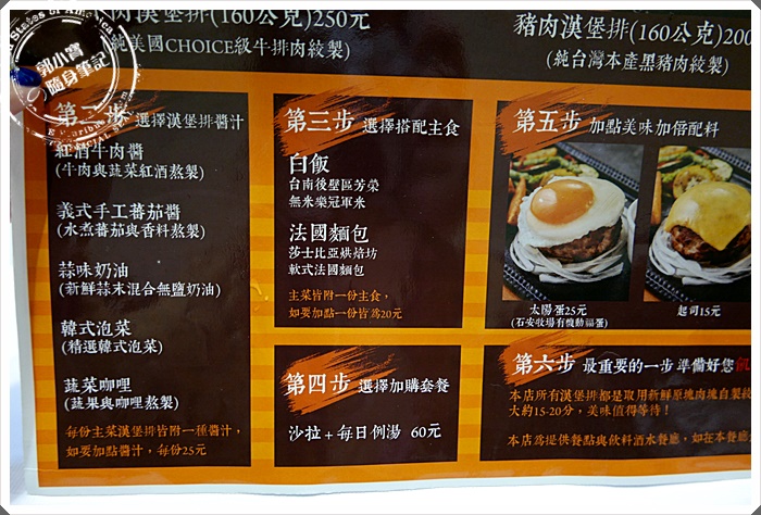| 菜單其實設計的相當簡單~主角漢堡排只有分成牛肉$250以及豬肉$200兩種,接下來只要選擇醬汁以及配餐還有額外加料的部分...再來就是把你的胃準備好。 |