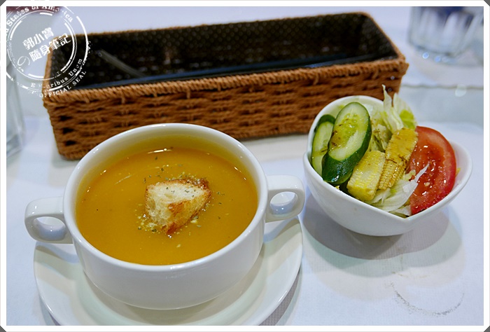 | W哥加購了套餐,寶妹因為很怕吃不完所以沒有加點,湯品今天是南瓜濃湯,但有點不及格,味道普普通通,也沒有到非常有熱度...沙拉則是普通平凡,只能說增加膳食纖維用。 |