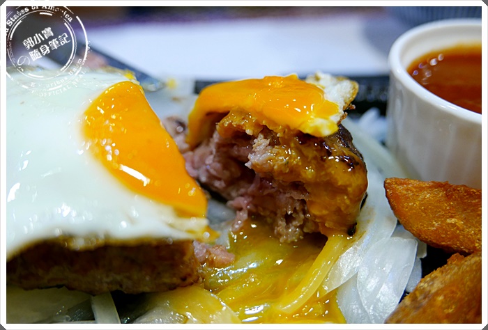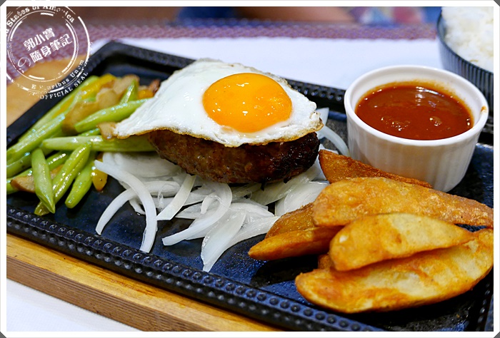 | W哥不吃牛,所以我們直接就一人各點一牛一豬了,首先上桌的是豬肉漢堡排,W哥還加上了一個太陽蛋,比起DM照片上其實是小了一點,乍看之下有點弱弱的,但其實還是充滿了肉香在鐵板當中滋滋作響。每一份上都是有洋蔥四季豆、楔型馬鈴薯、還有配上所選的醬汁。 |