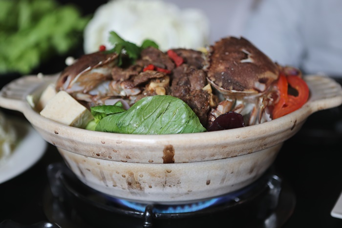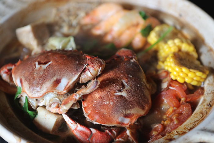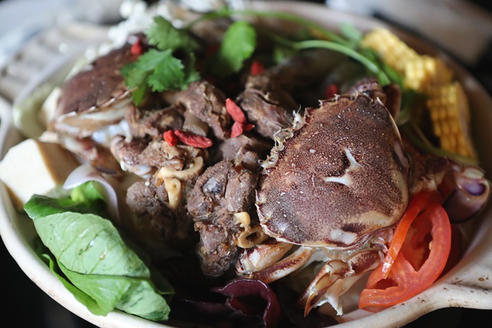 | 海鮮羊肉爐上來的時候我們一群人都嚇到了,這麼大一鍋而且食材滿到一整個很誇張,重點是用我最喜歡的砂鍋煮的,我最喜歡用砂鍋煮火鍋了,陶土砂鍋因為會呼吸的關係,所以煮起來的滋味都繪滿特別的,因為我們這次來的人有六個人,可能因為鍋子的關係,所以最多只有四人鍋,看到這滿滿的一鍋真的很誇張,兩隻黃金蟹以外,還有滿滿的羊肉跟蝦子及蔬菜還有一堆火鍋料,真的超尖的一鍋。 |