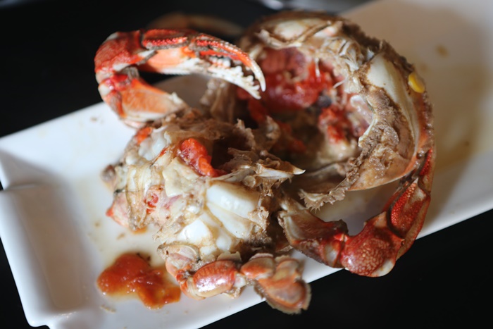 | 看看這煮到辦紅的黃金蟹真的超誘人了,這樣才1399真的非常的划算,讓我們一群人吞了好幾口的口水。 |