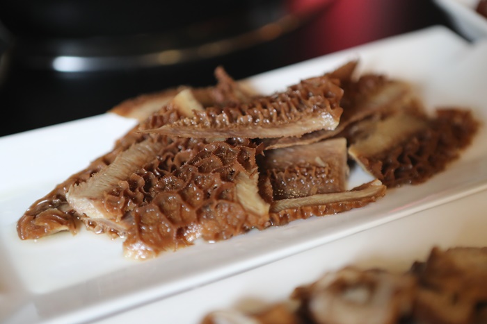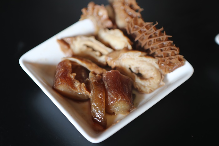 | 不管是大腸頭還是牛肚、牛筋好像都有事先稍微滷過的樣子,顏色看起來都已經還滿入味的,店員也是跟我們說不用煮太久,通常我對會怕之前滷過的味道就很重了,再下重口味的鍋品會使這些食材過鹹。 |