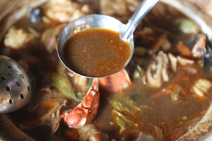 | 所有的食材都入鍋煮了以後,最期待的就是這湯頭了,一夥人趕緊舀上一碗嘗鮮,真的很好喝,本來抱著懷疑態度會過鹹的其實並不會,有海鮮的鮮甜且溫潤順口,看起來很重口味的湯頭喝起來真的會讓人一碗接著一碗停不下來,真的很好喝耶!!!! |