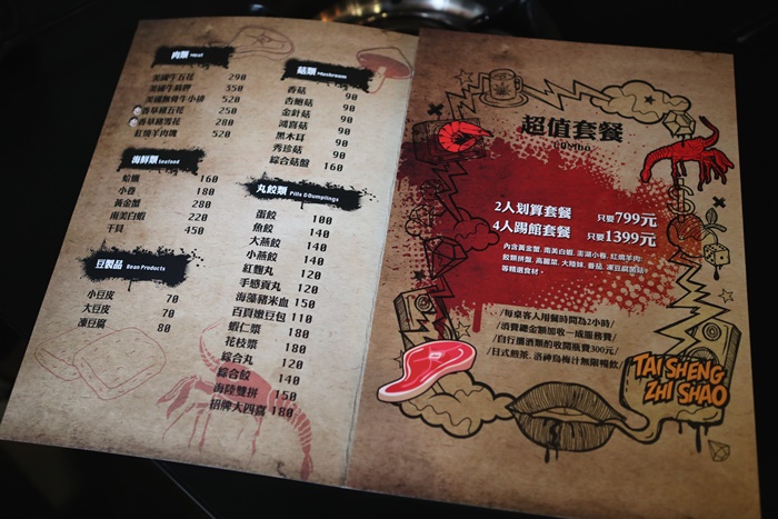 | 台省製燒菜單內容也滿簡單的,價位算是可以接受的範圍內,起鍋的部分還滿划算的,起鍋也有套餐可以選擇,兩個人799的價位在大台北地區來說真的不算貴,而且套餐裡面就含有黃金蟹跟海鮮食材了,划算划算! |