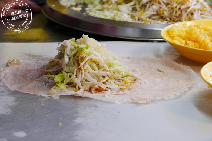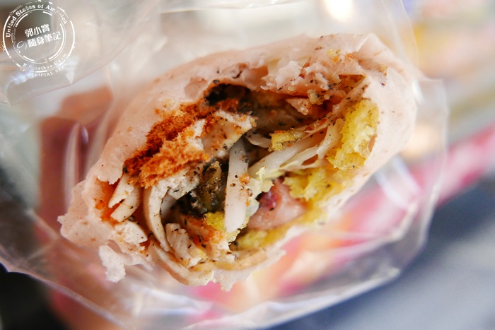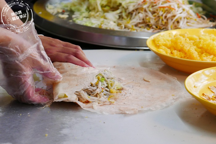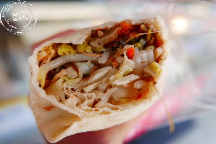 | 店家使用兩張餅皮,可以包比較多食材外,整體吃起來比較Q,看看這鋪滿豐盛的配料還有大量蔬菜,營養滿分。 |