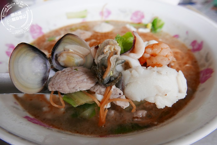 | 老闆送上桌的時候噢北編都傻眼了,一樣用碗公裝,不誇張份量真的很大,也太超值了吧,用料非常實在,裡頭有滿滿的蛤蜊、蚵仔、豬肉絲、蝦仁、花枝、貢丸、魚丸,最誇張是還有鱸魚,噢北編超少吃到鍋燒麵有鱸魚的,這配料真的太驚人了,非常新鮮湯頭也非常夠味,再搭配滿滿的綠色蔬菜跟胡蘿蔔絲,營養滿分飽到嫑嫑的。 |