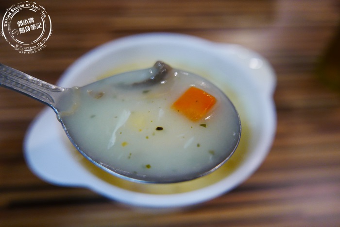 | 濃湯感覺沒有勾芡的非常濃稠,輕輕淡淡的香甜順口,奶香沒有很重,蔬菜的甜還有菇類的濃郁,灑點胡椒粉增加香氣,這樣的濃湯已經算很好了,清爽好喝。 |