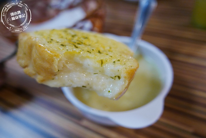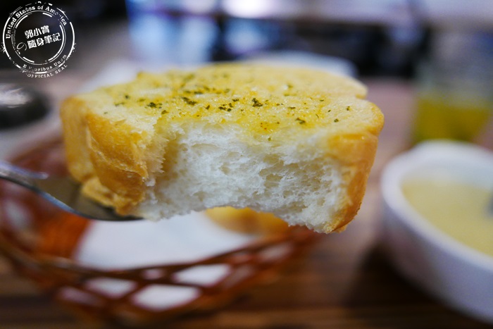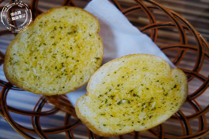 | 隨餐附贈的香蒜麵包,他們家的香蒜麵包是有厚度的喔,有點法國麵包的感覺,外表酥脆但不會過於乾硬,蒜頭抹醬帶點香料,一口咬下蒜香十足又脆又香。 |