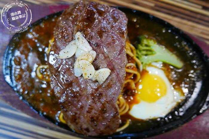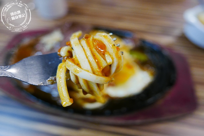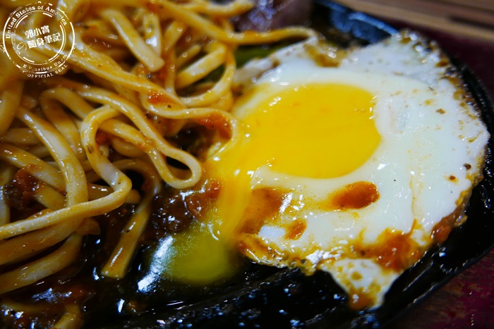 | 牛排麵, 就是一般在夜市吃的那種牛排都會看到的白麵,他們家份量給的很多,吃不夠還可以再加就怕客人吃不飽,噢北編選綜合醬(就是蘑菇醬跟黑胡椒醬調配的)麵條吸附醬汁滑順又飽足,蘑菇醬的甜還帶點黑胡椒的香氣跟辣度,融合在嘴裡一口接著一口停不下來。 |