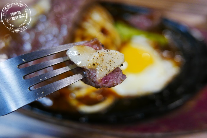 | 牛排上有附一些蒜片,噢北編喜歡搭配著吃,多了蒜頭的香氣濃郁更好吃,更能突顯肉汁的甜,帶點微焦氣息的牛排搭配蒜香超銷魂的,一口吃下超滿足。 |