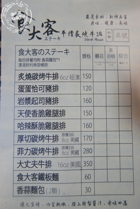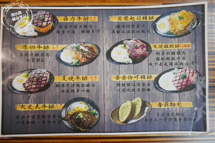 | 菜單還會另外附一張有圖片跟介紹的,方便客人選擇,每一樣都看起來好好吃,牛排有分哪裡進口的也有分重量,想吃很多肉的可以點大丈夫牛排,菜單上的價格很平價,有什麼醬料也表示得很清楚,非常方便點餐。 |