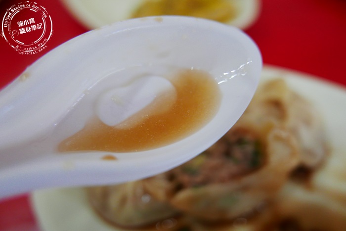 | 一顆湯包流出來的湯汁,真的有湯汁喔!噢北編就吃過其他專賣湯包的早餐車的湯包,根本就沒湯汁,他們家的有耶,非常新鮮甘甜,而且很有味道超讚的。 |