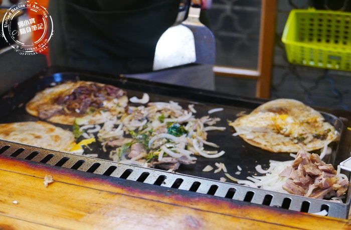 | 煎檯上滿滿的餅跟料,老闆娘很忙手都沒有停過,在旁邊等待香味一直竄出,默默的都餓了。 |