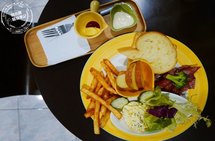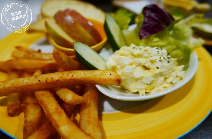 | 拼盤內容有德式香腸、培根、各式生菜水果、蛋沙拉、丹麥麵包,滿滿的一盤超豐盛的,營養又飽足。 |