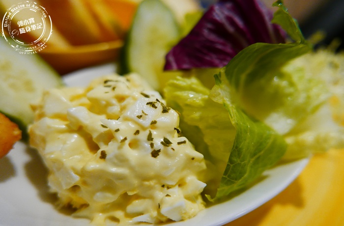 | 蛋沙拉,這道非常清爽,水煮蛋切丁狀加上美乃滋調味,蛋白部分QQ彈彈的美乃滋的濃郁香氣,還帶有點不知道是蛋黃還是馬鈴薯沙沙的口感,甜甜的非常好吃。 |