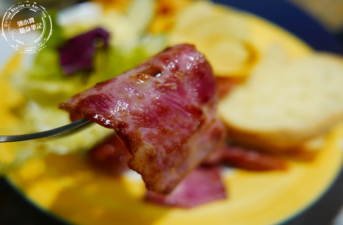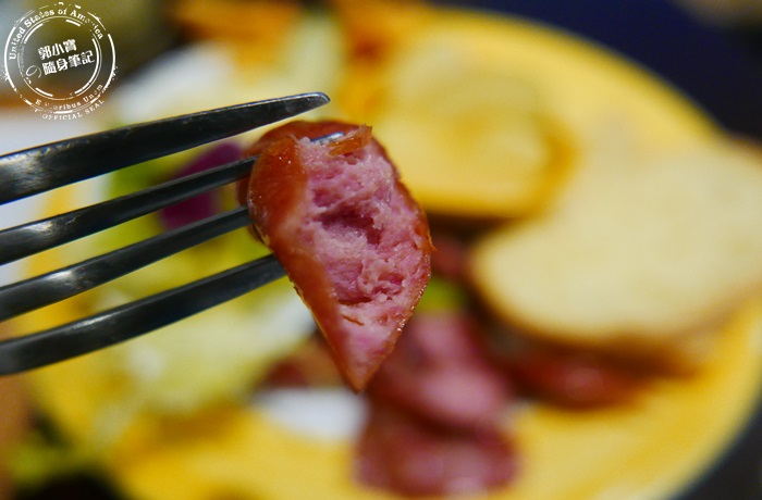 | 德式香腸,店家送上來的時候是已經切好的,不是一整條完整的,但是切面沒有很美,不知道是刀太鈍地還是太忙碌之類的,總之德式香腸煎的剛剛好,肉不會太乾太柴咬下還是有肉汁,而且味道很夠煙燻香味也有出來,越咬越香。 |