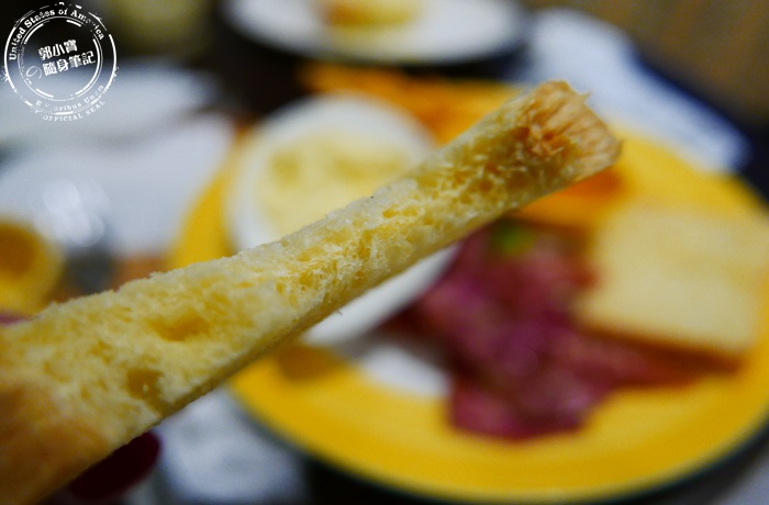 | 丹麥吐司,因為也沒有看到其他任何沾麵包的抹醬,所以就只好這樣單吃然後再配上拼盤裡面的食材,噢北編覺得蠻乾的說,但吃的到原本吐司的鮮甜跟香氣,可以細細品嚐的美味。 |