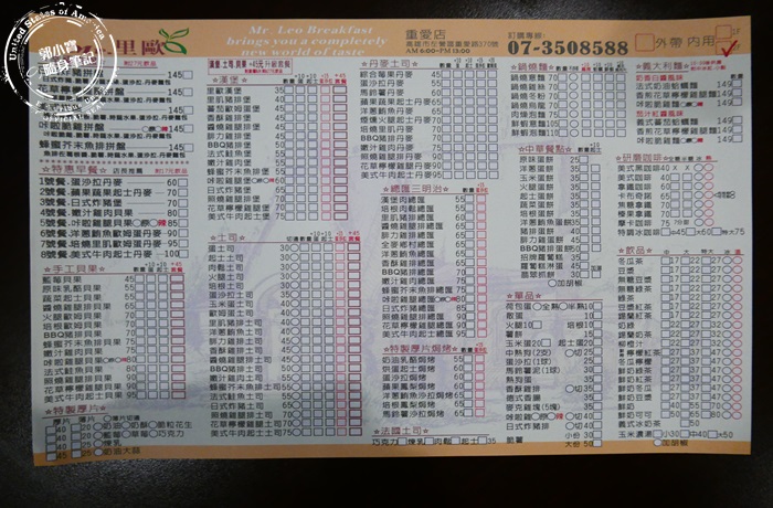 | 他們家的菜單滿滿的一大張,各式各樣都有想得到的早餐這也通通都有,拼盤類、吐司、三明治、蛋餅、焗烤、鍋燒類都有,菜單分類明確寫的也都很詳細,格子也都編排得方便填寫。 |