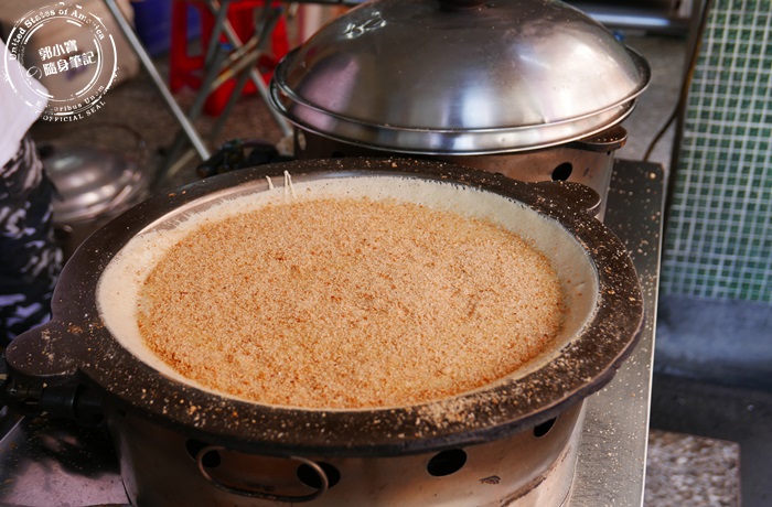 | 旁邊的兩個石鍋製作石鍋餅,等待的過程中可以看老闆表演製作過程,鍋子很大放入麵糊再鋪滿滿的一層花生粉在上面,北編在一旁一直聞到香氣,光用看得都餓了。 |