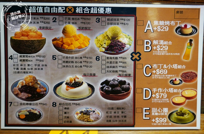 | 菜單很大一張, 店裡除了有賣茶品之外還有冰品,而且都有附圖片讓客人看得更清楚決定要點什麼,其實會發現這一家店主要是因為他們有抹茶系列,喜歡品茶的朋友們也可以來這家試看看,看到他們家的冰整個大失控,每款都看起來超好吃,而且價錢都蠻平價的,還有分正常版跟豪華版,所以價格上就是有點區別,所以全靠每個人的喜好做搭配,小資族可以選擇冰品跟甜點搭配組合,節省荷包。 |