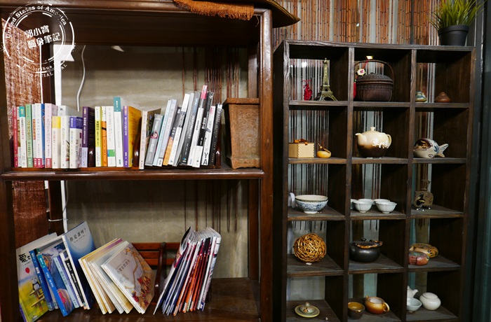 | 門口進來靠牆壁有書櫃,書櫃裡有很多雜誌小說提供給客人閱讀,在這麼棒的氛圍下品茶再加上書本的薰陶,提升個人的氣質跟魅力,旁邊的櫃子也擺放很多茶壺、茶杯的藝術品,整家店的木頭色系很多, 讓人感覺溫暖。 |