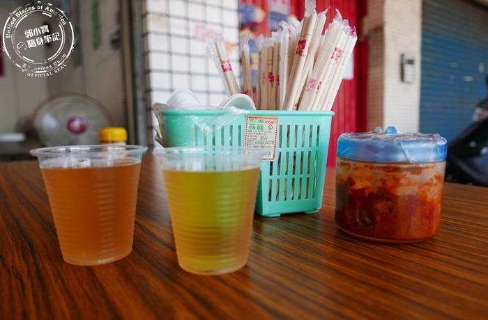 | 桌上都會附餐具跟調味料,桌上的兩杯飲料是店家提供冷飲給客人的,不要以為有兩種飲料只有一種,其實只是因為背景關係導致兩杯相同的飲料卻有不同的色澤,飲料的部分要說紅茶也不太像,因為茶香味沒有很重,只有淡淡的味道跟些許甜味,應該是冰塊太多融化掉導致味道沖淡,不過很冰涼所以很解渴,這大熱天有冰涼的飲料最棒了。 |